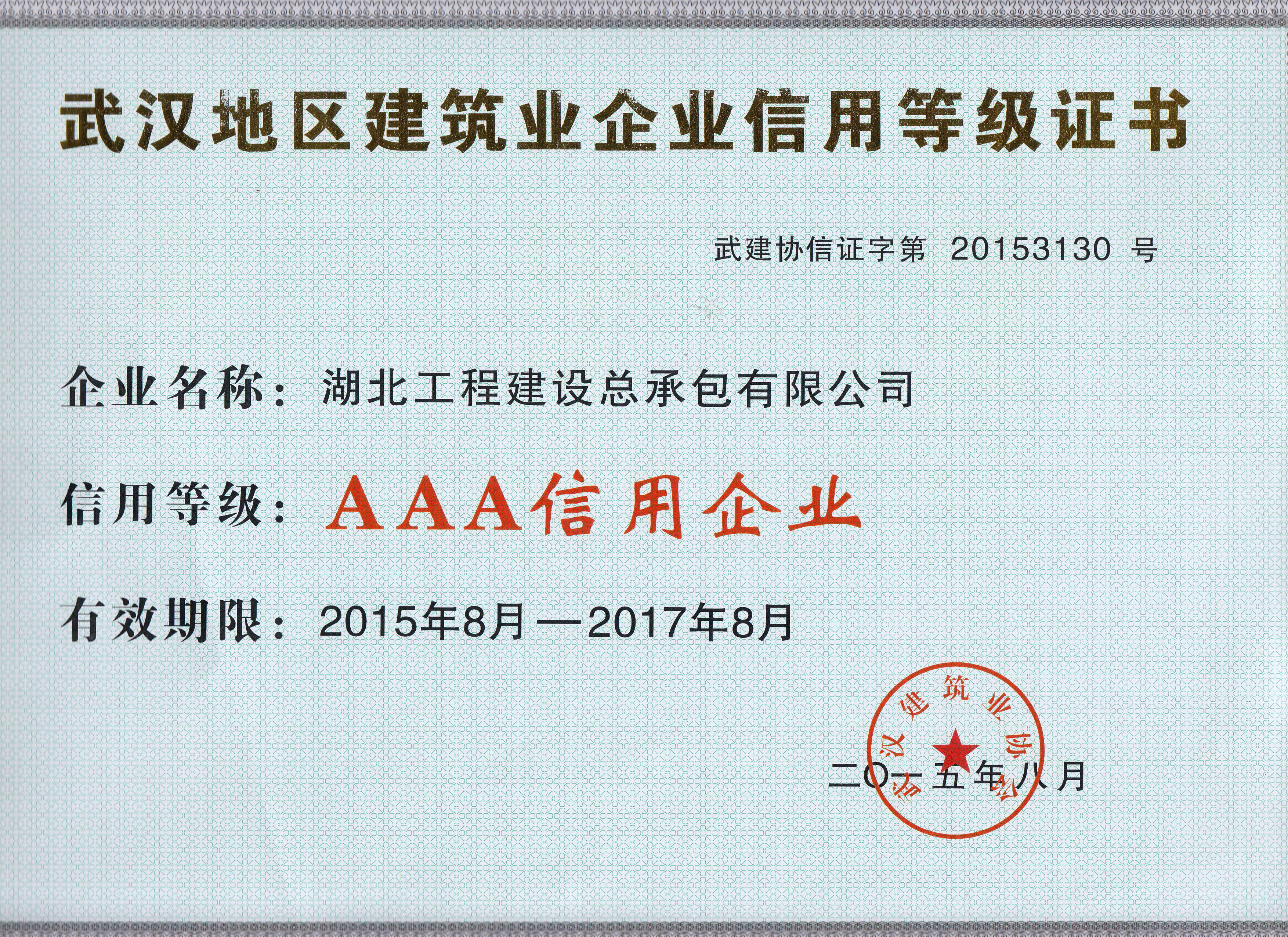 近日,武汉建筑业协会公布了2015年武汉建筑行业信用企业等级评定结果,我公司再次荣获AAA级信用企业称号。此次AAA级信用企业评审,是经企业自评申报、各区建筑业协会(汉办)推荐、专家评委初审、市各站办审核、上网公示、评定领导小组和会长办公会审定,177家企业为AAA级信用企业、24家企业为AA级信用企业。
